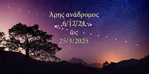 Ο Άρης αγκαλιάζει το τέλος του 2024 και την αρχή του νέου έτους σε ανάδρομη κίνηση, ως την 24η Φεβρουαρίου 2025. Θα ξεκινήσει από την 6η μοίρα του Λέοντα και θα ολοκληρώσει τη διαδρομή στην 17η μοίρα του Καρκίνου.