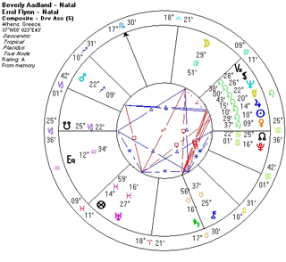 – Η Αφροδίτη με τον Πλούτωνα (έρωτας και πάθος) έκαναν σύνοδο με το μεσοδιάστημα Ήλιου/Σελήνης του σύνθετου, μεσοδιάστημα των σχέσεων. Όλη η περιγραφή, που είναι συνοπτική για να χωρέσει στα πλαίσια ενός άρθρου φέρνει συνέχεια στο φως, την μαγνητική και έντονη ερωτική έλξη, το πάθος που αναπτύχθηκε και παρέσυρε τον Έρολ Φλυν και τις επιπτώσεις που είχε το χάσιμο του ελέγχου και η ακόρεστη ανάγκη για ικανοποίηση. Είναι βέβαιο πως και για τους δύο αγαπημένους, ο ερωτισμός έπαιζε πρωτεύοντα ρόλο. Αλλά είναι επίσης διαπιστωμένο από τα στοιχεία, πως η σχέση αυτή έφερνε στα άκρα την κατάσταση και οδήγησε στο τραγικό τέλος.