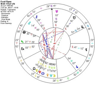 Στις γενέθλιες προδιαγραφές του, ο Έρολ Φλυν είχε τον Ήλιο στους Διδύμους, τον Ωροσκόπο στον Κριό και την Σελήνη στον Καρκίνο. Έξυπνος, ευέλικτος και ικανός στον λόγο (σύνοδος του Ερμή με τον Πλούτωνα και τον Ήλιο στους Διδύμους), έχοντας τονισμένο τον 3ο οίκο, στοιχεία σημαντικά για ένα ηθοποιό.