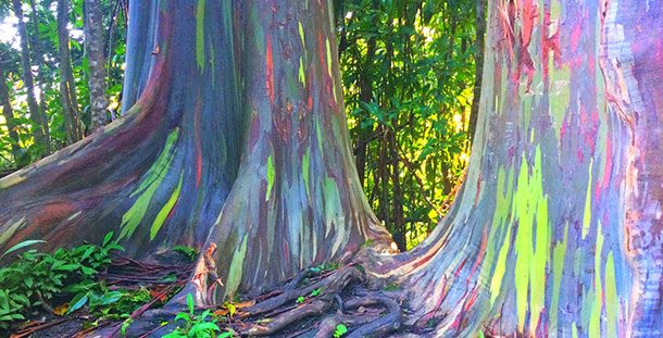 Το εκπληκτικό αυτό δέντρο, μοιάζει με πίνακα ζωγραφικής. Ο ευκάλυπτος του ουράνιου τόξου (Eucalyptus deglupta) πήρε το όνομά του από τις ζωηρές χρωματιστές λωρίδες στον κορμό του, οι οποίες εμφανίζονται επειδή στην πάροδο των χρόνων, ρίχνει τον λεπτό φλοιό του, και εμφανίζονται αποχρώσεις διαφορετικές και πανέμορφες στον φλοιό που απομένει.
