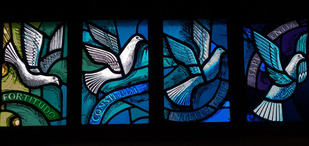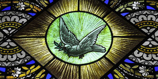 Κεντρική Φωτογραφία: Εκκλησιαστικό βιτρώ με αναπαράσταση του Αγίου Πνεύματος, σε καθολική εκκλησία στο Trinity, Indiana